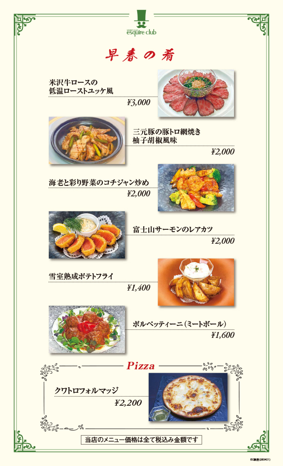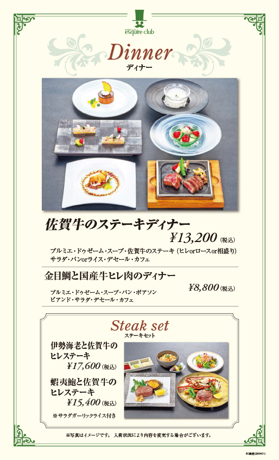 銀座店 2025.04.18ニュース《伊豆下田沖金目鯛と仙台牛のシルクハットディナー》販売期間:4月1日~5月6日 各種ディナーコース 今月のおすすめ お料理内容は仕入れ状況等により変更させていただく場合がございます。ご了承ください。当店の価格は全て税込み表示となっております