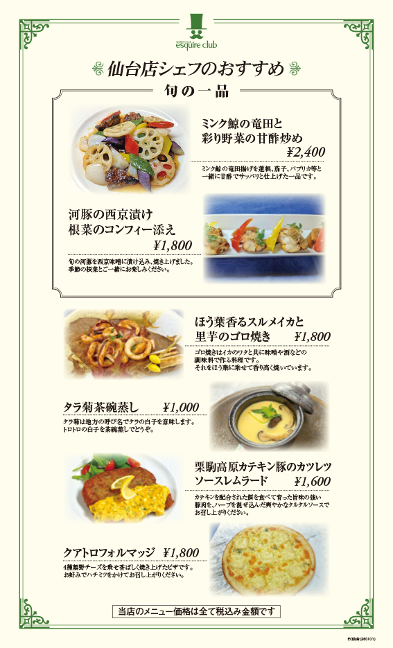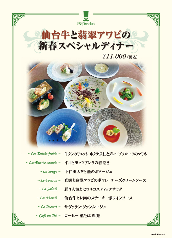 仙台店 12月のご案内《国産牛と真鯛のオリジナルディナー》販売期間:1月5日~1月31日 《仙台牛と翡翠アワビの新春スペシャルディナー》販売期間:1月5日~1月31日 《仙台店シェフのおすすめ》エスカイヤクラブ仙台店のホームページをご覧頂き、誠に有難うございます。 仙台店へのご予約はこちらからお願い致します。
