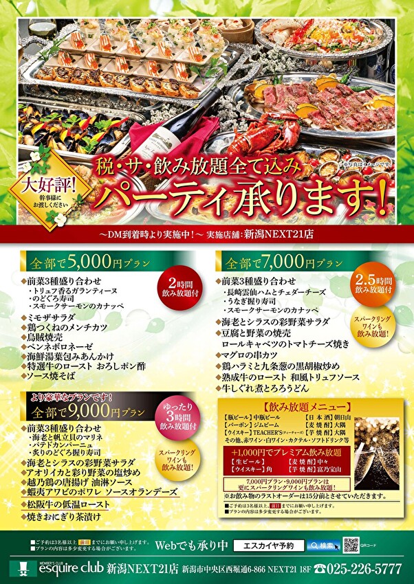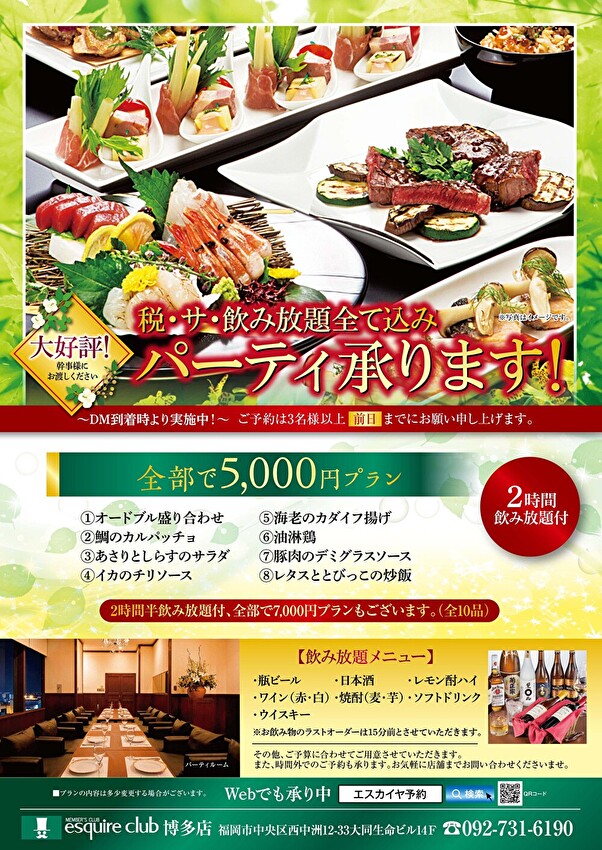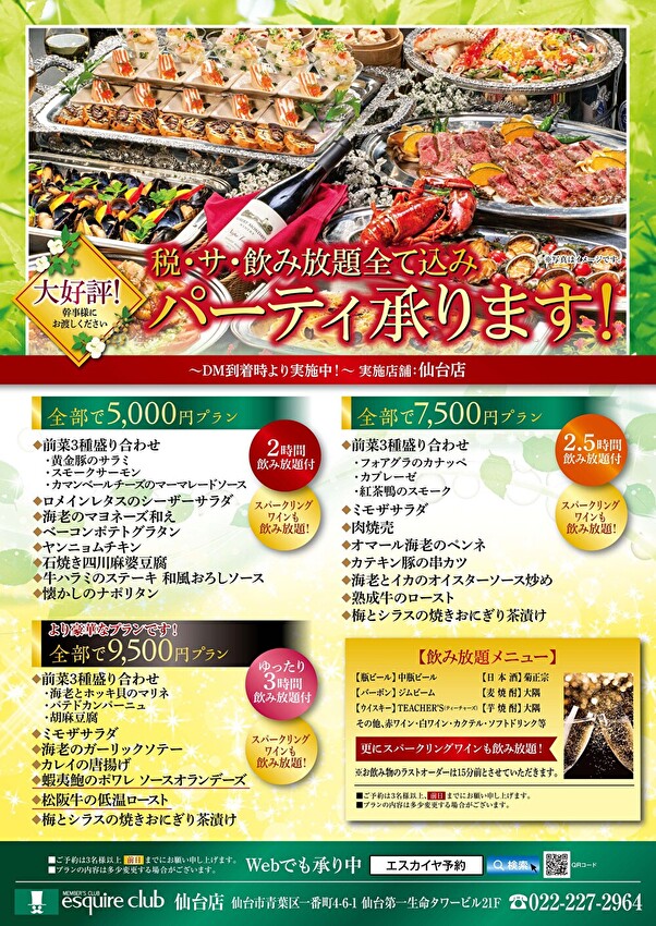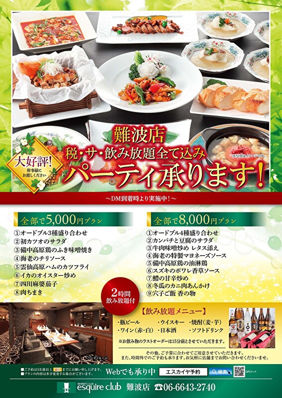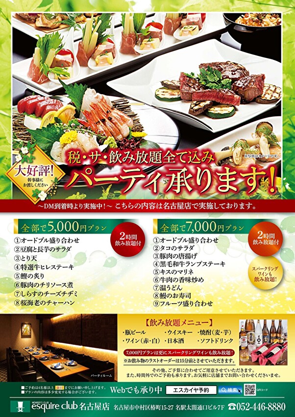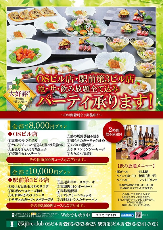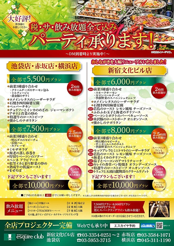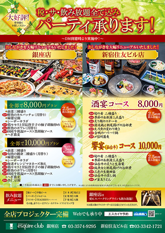 大好評! 新緑のパーティープラン! ご予約承ります! 2026.04.24ニュース会員様に大変ご好評の税・サ・飲み放題込みパーティープランを 各エリア・各店舗にてご準備させていただきます。 幹事様にご案内いただけますと幸いです。 お席に限りがございますので是非お早めにご予約ください。 【銀座店/新宿住友ビル店】 【池袋店・赤坂店・横浜店/新宿文化ビル店】 【OSビル店・駅前第3ビル店】 【難波店】 【仙台店】 【新潟NEXT21店】 【名古屋店】 【博多店】