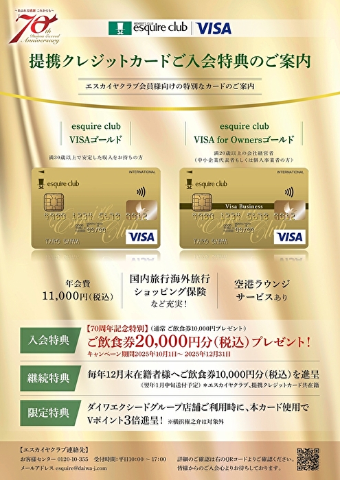 【12/31迄70周年特典つき!】esquire club VISAゴールドのご案内