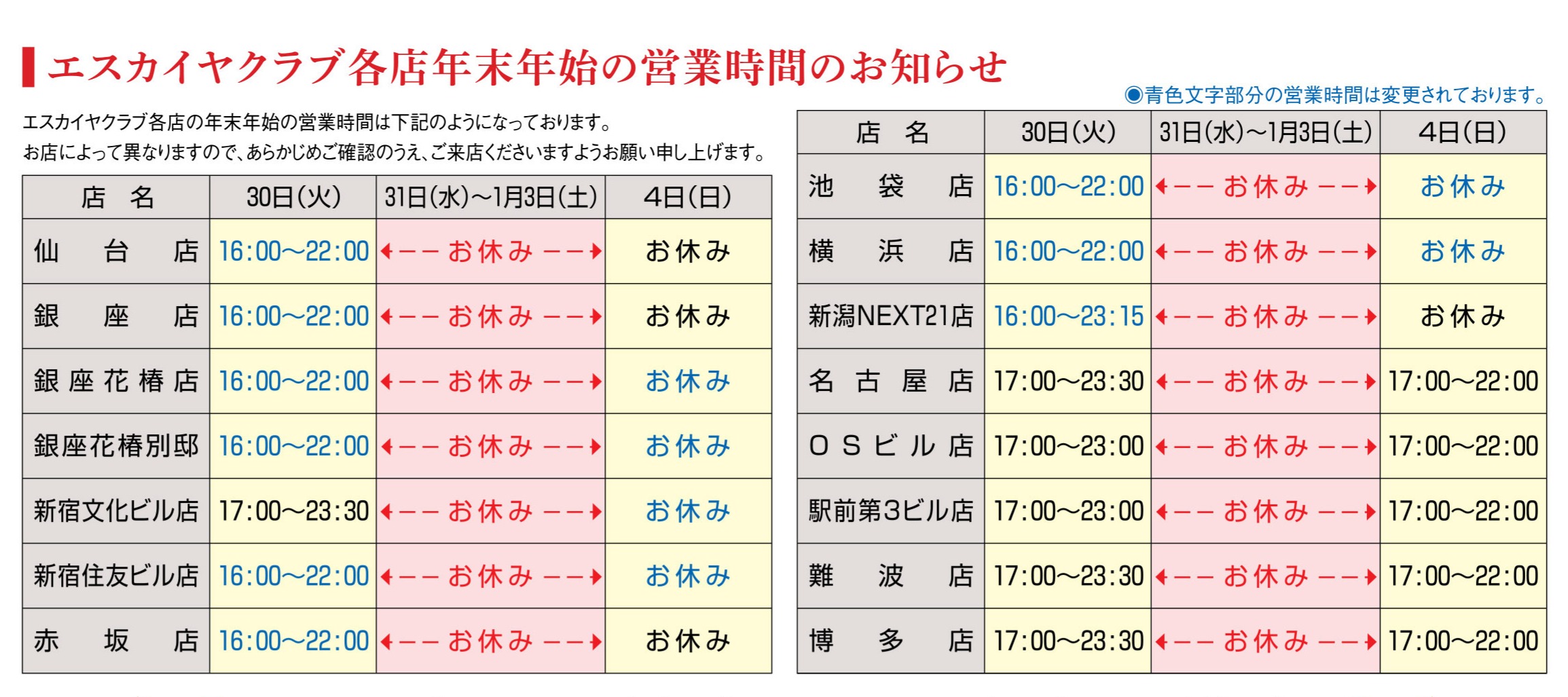 エスカイヤクラブ各店の年末年始の営業時間をご案内いたします。